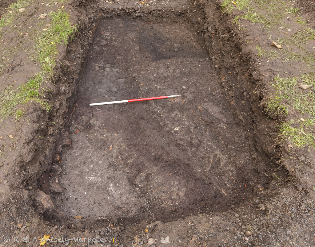 Trench 2, Day 4. The whole of the trench has been lowered to the level of Slot 3. Some interesting surfaces are revealed.